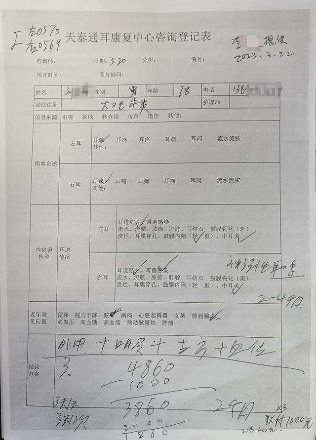 陈敏介绍,执法人员调查运康堂店内3人及一名顾客发现,李女士作为运康堂负责人,主要负责宣传推广。李女士的丈夫胡某负责接待顾客,利用小可视设备等检查顾客耳道情况,后在一张咨询登记表上填写相关信息,包括内窥镜检测后的“耳道红肿”“霉菌感染”等情况,以及“外用+口服+古方+血(穴)位”的结论方案。最后,再由员工刘某使用云刀等工具为顾客进行处理,将“天泰通滴耳液”的医疗器械滴入耳内。胡某在接诊过程中,是按疗程给顾客计算费用。