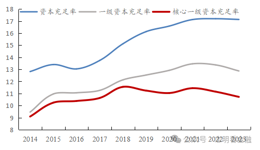 资本充足率总体保持稳定。截至23年末,核心一级/一级/资本充足率分别为10.72%、12.87%、17.4%,较22年末分别下降0.43/0.50/0.06个百分点,资本充足率有所下降。