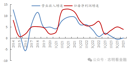 图1:2023年农业银行营收增速+0.03%,归母净利润增速+3.90%(%)