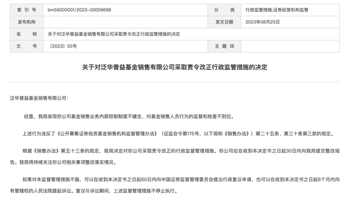 泛华普益对外可谓是“口吐莲花”抠细节的找理由,但是对内的监督“一塌糊涂”。2023年8月份四川证监局发布了一条对于泛华普益采取行政监管措施的决定。指出公司基金销售业务内部控制制度不健全,对基金销售人员行为的监督和检查不到位。