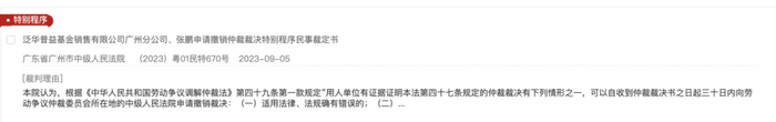 随着深入的了解,督都发现泛华普益公司旗下这样的“骚操作”,其实不止出现了一次。2023年9月裁判文书网还发布过泛华普益广州分公司同样不服法院判决,申请撤销之前张某的劳动仲裁裁决纠纷一案。