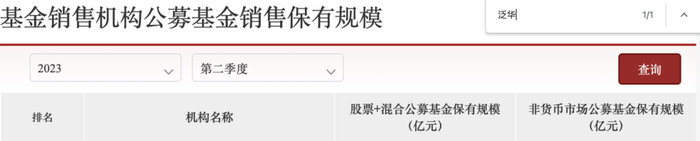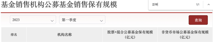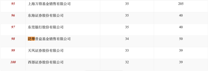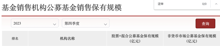 反观一下泛华普益近两年的业绩,据中基协数据显示2023年1至3季度泛华普益公司均在基金销售机构前一百名的榜单中,但在2023年4季度榜单中却“消失”了。同时2023年4季度百强榜单中股票+混合公募基金最低规模为32亿,也就意味着泛华普益连32亿的规模都没达到。