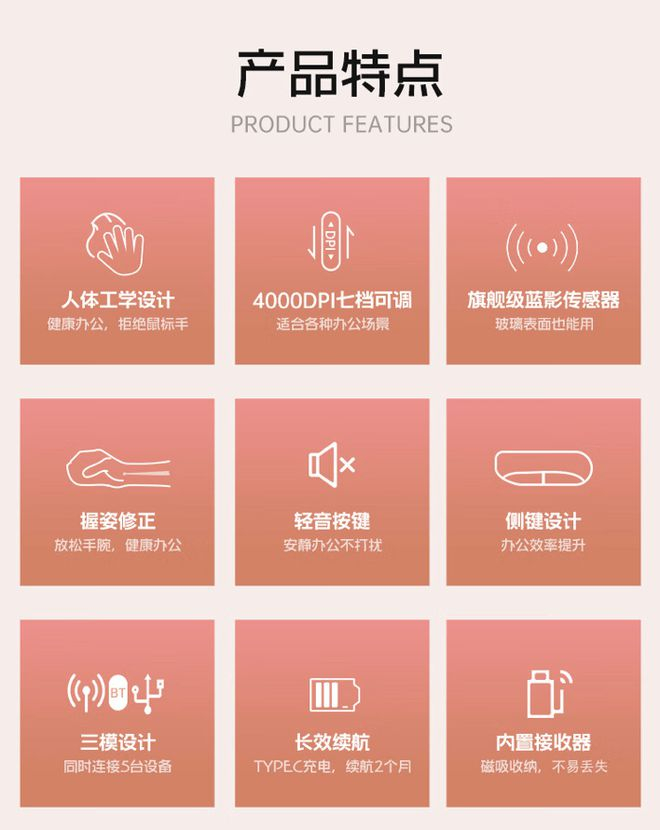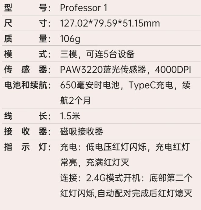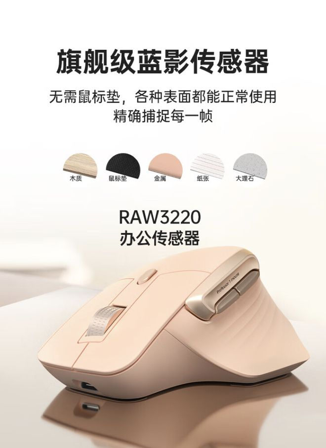 据介绍,这款鼠标重量106克,采用人体工程学设计,尺寸为127.02 x 79.59 x 51.15 mm,可选七档4000 DPI,搭载蓝影 RAW3220传感器,使用650毫安时电池,号称一次充电续航可以使用2个月。