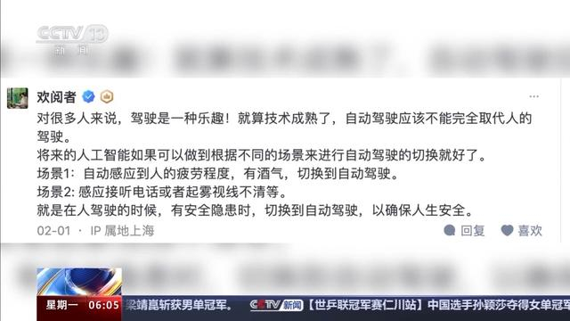 对于新生事物,有人期待、有人顾虑,记者发现,网友对自动驾驶的讨论也在一直持续。有网友认为驾驶本身是一种乐趣,不能完全被自动驾驶取代,未来希望可以根据场景自主选择驾驶模式;也有网友说,自动驾驶时代,或许可免去人们考驾照的烦恼;还有网友对自动驾驶技术的成熟度感到担忧。