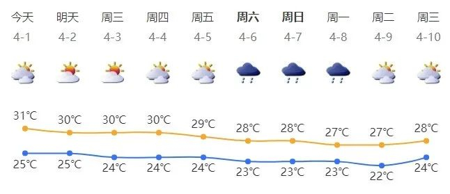 深圳今日多云;气温25-31℃;南风3-4级,沿海、高地和海区阵风6-7级;相对湿度65%-95%。