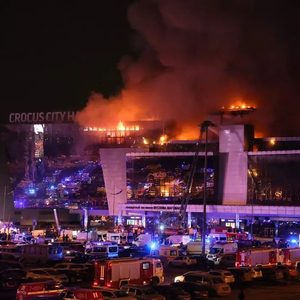 当地时间2024年3月22日,俄罗斯莫斯科近郊,克罗库斯城音乐厅(Crocus City Hall)遭遇恐怖袭击,音乐厅燃起大火。视觉中国 图