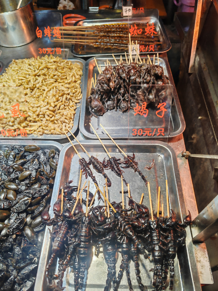 建政路夜市街的一家昆虫摊里摆着8个不锈钢盆,分别装着蜈蚣、蝎子、豆虫、蚕蛹、蜂蛹、竹虫、蚂蚱及“土狗”(蝼蛄)。这些昆虫都被油炸过,有的通体金黄,有的乌黑发亮。一只蝎子30元、一条蜈蚣20元,其余的按份卖,售价15元至30元不等。