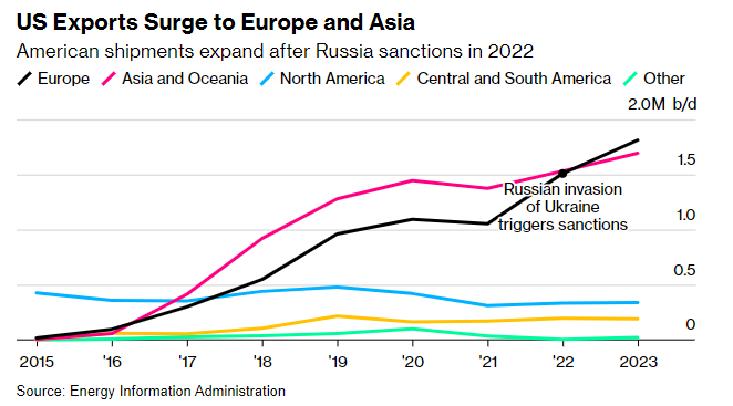 但制裁的影响显然是不容忽视的——由于欧洲国家急欲寻求那些非俄罗斯的供应来源,美国对欧洲的原油出口量明显增加。从2021年到2023年,美国对法国的出口增长了近40%,对西班牙的出口增长了134%。