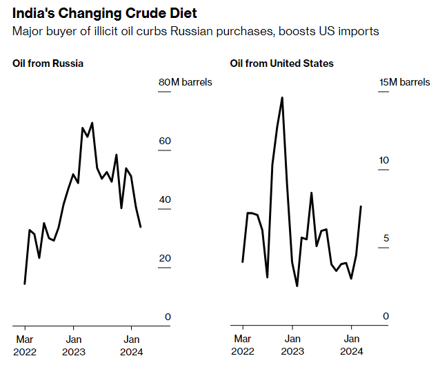 Kpler首席美洲石油分析师Matt Smith表示,尽管由于油质和航行时间的差异,美国的供应尚无法完全替代俄油,但肯定会有一些转向,即(印度)会引入更多的美国原油。