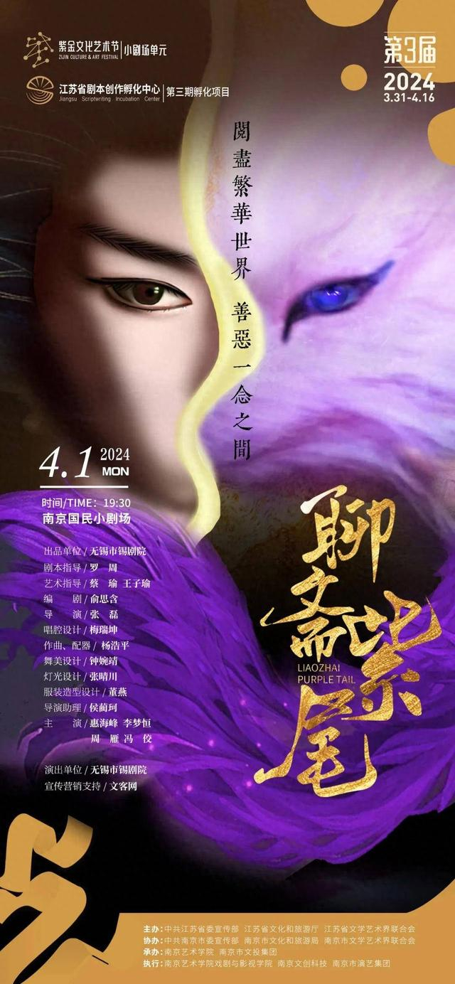 将于4月1日19:30在南京国民小剧场上演的锡剧《聊斋·紫尾》,其构思创意来源于中国清朝小说家蒲松龄创作的文言短篇小说集《聊斋志异》。