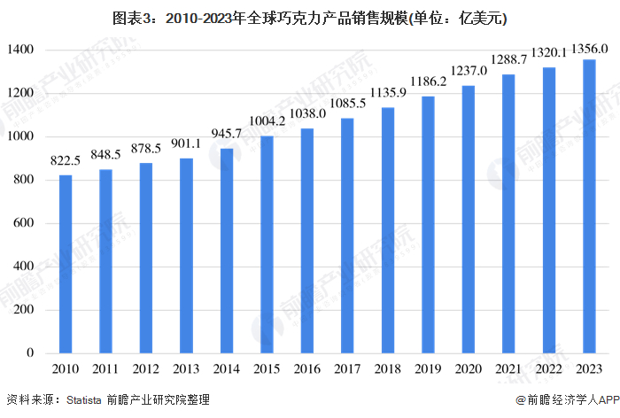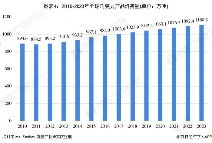 2010年以来,全球巧克力产品销售规模稳步增长,Statista数据显示,2019年全球巧克力产品销售规模达1186.2亿美元,同比2018年增长4.4%,预计2020年全年销售额可达1237.0亿美元,到2023年全球销售额将超过1350亿美元。按照消费量计,2019年全球巧克力产品消费量达1042.4万吨,同比2018年增长1.8%,预计2020年全年消费量可达1060.1万吨,到2023年全球消费量将超过1100万吨。