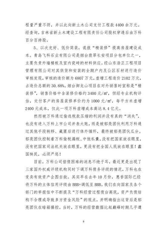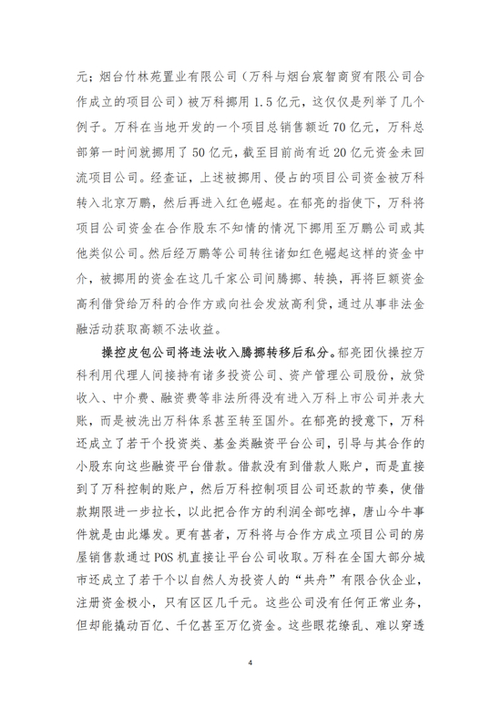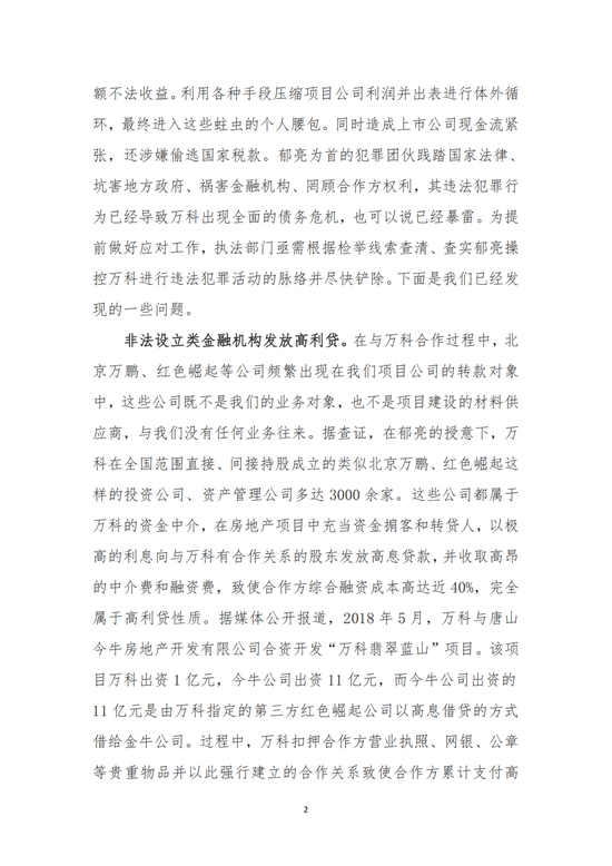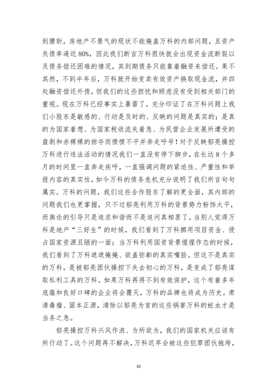 目前,万科公司偿债困难的消息不绝于耳,最近更是出现了三家国外权威评级机构同时下调万科债务评级的情况,万科也在变卖有效资产企图自救。其实早在去年10月份,惠誉国际已经将万科的主体信用评级由BBB+调低至BBB。我们在向国家及各个部门的举报信中不断提及“万科经营过程债台高筑,资产负债结构不合理或导致多方资金风险”的观点,并明确指出这背后是郁亮团伙在暗箱操控。当时,万科的经营数据比起巅峰时期几乎遭到腰斩,房地产不景气的现状不能掩盖万科的内部问题,且资产负债率逼近80%,因此我们断言万科很快就会出现资金流断裂以及债务偿还困难的情况,其到期债务只能靠着融资来偿还。果不其然,不到半年后,万科就开始变卖有效资产换取现金流,并四处融资偿还外债,但我们的这些担忧和顾虑没有受到相关部门的重视。现在万科已经事实上暴雷了,充分印证了在万科问题上我们小股东是敏感的、行动是及时的、反映的问题是真实的;是真的为国家着想、为国家税收流失着急、为民营企业发展所遭受的盘剥和赤裸裸的掠夺而愤愤不平并奔走呼号!对于反映郁亮操控万科进行违法活动的情况我们一直没有停下脚步,在长达8个多月的时间里一直奔走疾呼,一直强调问题的紧迫性、严重性和举报内容的真实性,如今万科的债务危机充分说明了我们所言句句属实。万科的问题,我们这些合作股东了解的更全面,其内部的问题我们也更掌握,只不过郁亮利用万科的背景势力粉饰太平,而舆论的引导只是追求和谐而不是追问真相罢了。当别人觉得万科是地产“三好生”的时候,我们看到了万科挪用项目资金、侵占国家资源丑陋的一面;当万科利用国资背景惺惺作态的时候,我们看到了万科遮遮掩掩、欲盖弥彰的真实嘴脸。但这不是真实的万科,是被郁亮团伙操控下失去初心的万科,是变成了郁亮谋取私利工具的万科。如果万科再得不到有效保护,这个有着多年底蕴和良好口碑的企业将会覆灭,万科的品牌也将成为历史。肃清毒瘤、固本正源,清除以郁亮为首的这些祸害万科的蛀虫才是当务之急。