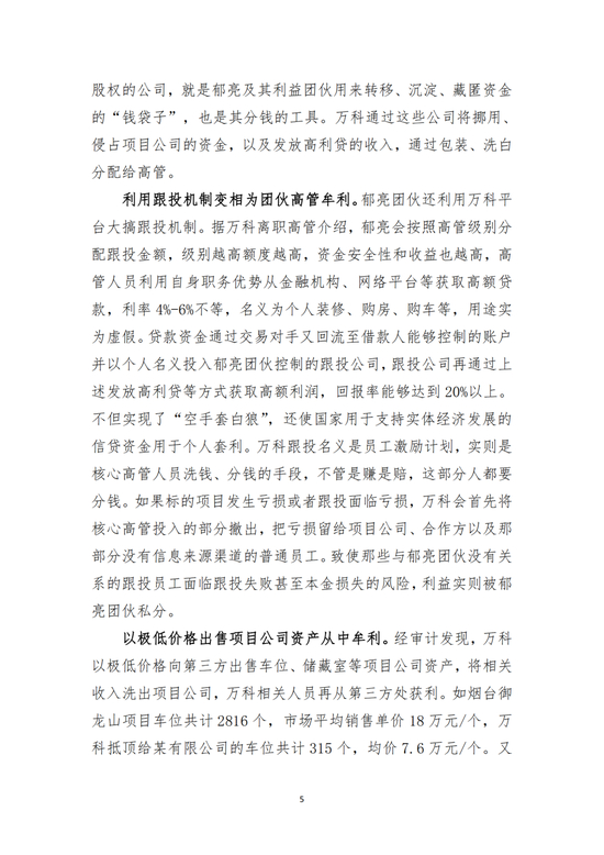 利用跟投机制变相为团伙高管牟利。郁亮团伙还利用万科平台大搞跟投机制。据万科离职高管介绍,郁亮会按照高管级别分配跟投金额,级别越高额度越高,资金安全性和收益也越高,高管人员利用自身职务优势从金融机构、网络平台等获取高额贷款,利率4%-6%不等,名义为个人装修、购房、购车等,用途实为虚假。贷款资金通过交易对手又回流至借款人能够控制的账户并以个人名义投入郁亮团伙控制的跟投公司,跟投公司再通过上述发放高利贷等方式获取高额利润,回报率能够达到20%以上。不但实现了“空手套白狼”,还使国家用于支持实体经济发展的信贷资金用于个人套利。万科跟投名义是员工激励计划,实则是核心高管人员洗钱、分钱的手段,不管是赚是赔,这部分人都要分钱。如果标的项目发生亏损或者跟投面临亏损,万科会首先将核心高管投入的部分撤出,把亏损留给项目公司、合作方以及那部分没有信息来源渠道的普通员工。致使那些与郁亮团伙没有关系的跟投员工面临跟投失败甚至本金损失的风险,利益实则被郁亮团伙私分。