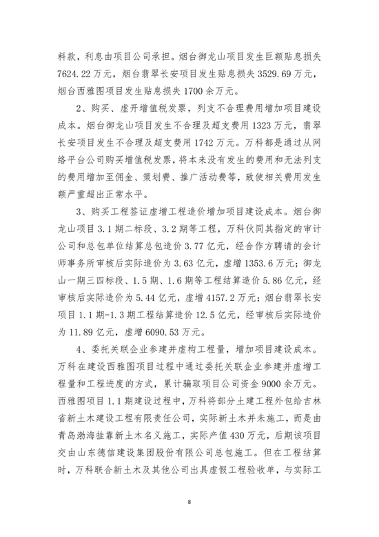 3、购买工程签证虚增工程造价增加项目建设成本。烟台御龙山项目3.1期二标段、3.2期等工程,万科伙同其指定的审计公司和总包单位结算总包造价3.77亿元,经合作方聘请的会计师事务所审核后实际造价为3.63亿元,虚增1353.6万元;御龙山一期三四标段、1.5期、1.6期等工程结算造价5.86亿元,经审核后实际造价为5.44亿元,虚增4157.2万元;烟台翡翠长安项目1.1期-1.3期工程结算造价12.5亿元,经审核后实际造价为11.89亿元,虚增6090.53万元。
