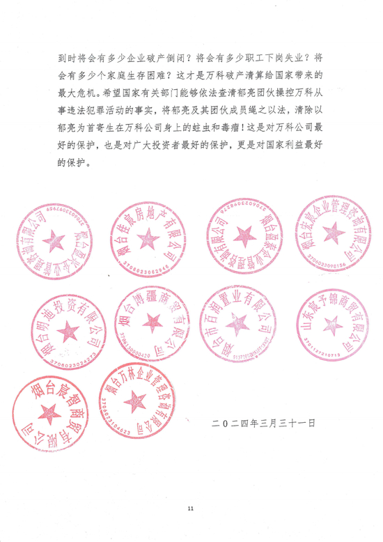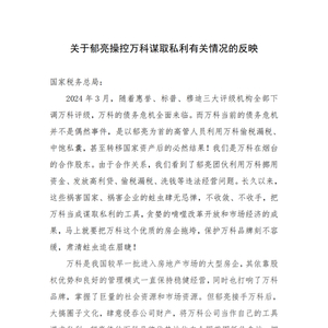 2024年3月,随着惠誉、标普、穆迪三大评级机构全部下调万科评级,万科的债务危机全面来临。而万科当前的债务危机并不是偶然事件,是以郁亮为首的高管人员利用万科偷税漏税、中饱私囊,甚至转移国家资产后的必然结果!我们是万科在烟台的合作股东。由于合作关系,我们看到了郁亮团伙利用万科挪用资金、发放高利贷、偷税漏税、洗钱等违法经营问题。长久以来,这些祸害国家、祸害企业的蛀虫肆无忌惮,不收敛、不收手,把万科当成谋取私利的工具,贪婪的啃噬改革开放和市场经济的成果,马上就要把万科这个优质的房企拖垮,保护万科品牌刻不容缓,肃清蛀虫迫在眉睫!