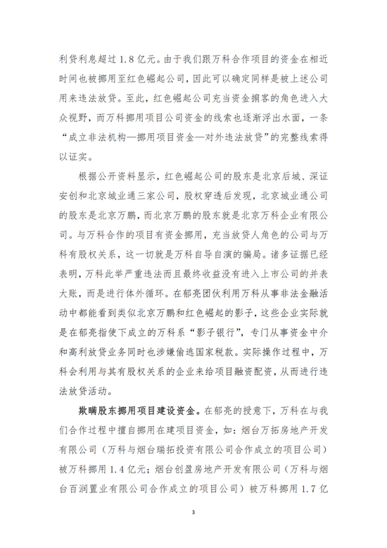 欺瞒股东挪用项目建设资金。在郁亮的授意下,万科在与我们合作过程中擅自挪用在建项目资金,如:烟台万拓房地产开发有限公司(万科与烟台瑞拓投资有限公司合作成立的项目公司)被万科挪用1.4亿元;烟台创盈房地产开发有限公司(万科与烟台百润置业有限公司合作成立的项目公司)被万科挪用1.7亿元;烟台竹林苑置业有限公司(万科与烟台宸智商贸有限公司合作成立的项目公司)被万科挪用1.5亿元,这仅仅是列举了几个例子。万科在当地开发的一个项目总销售额近70亿元,万科总部第一时间就挪用了50亿元,截至目前尚有近20亿元资金未回流项目公司。经查证,上述被挪用、侵占的项目公司资金被万科转入北京万鹏,然后再进入红色崛起。在郁亮的指使下,万科将项目公司资金在合作股东不知情的情况下挪用至万鹏公司或其他类似公司。然后经万鹏等公司转往诸如红色崛起这样的资金中介,被挪用的资金在这几千家公司间腾挪、转换,再将巨额资金高利借贷给万科的合作方或向社会发放高利贷,通过从事非法金融活动获取高额不法收益。