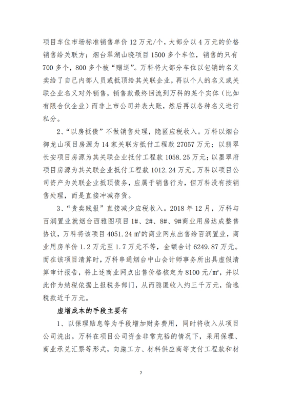 5、以次充好、低价简装,谎报“精装修”提高房屋建设成本。青岛飞科石业有限公司是烟台翡翠长安项目分包单位之一,主要负责外墙楼板及室内瓷砖的材料供应。经山东浩正工程项目管理有限公司对其供货和安装的全期户内及公区石材进行造价审核发现,审核的造价额为6807万元,虚增工程造价2102万元,占造价总额的30.88%。烟台御龙山项目在对外销售时宣称是“精装修”,销售价格中含装修价格约3400元/㎡,但经专业机构评估,交付客户的房屋装修单价约为1000元/㎡,每平方米虚增2400元成本,仅此一项万科虚增成本高达8.4亿元。