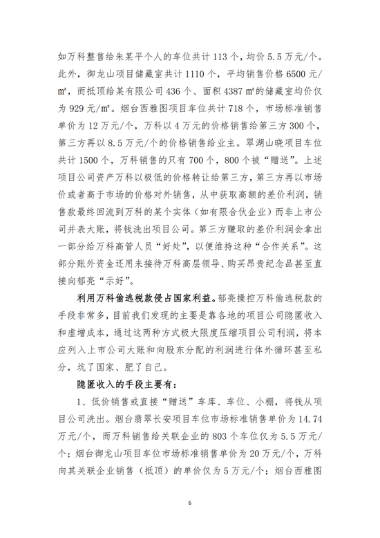 1、低价销售或直接“赠送”车库、车位、小棚,将钱从项目公司洗出。烟台翡翠长安项目车位市场标准销售单价为14.74万元/个,而万科销售给关联企业的803个车位仅为5.5万元/个;烟台御龙山项目车位市场标准销售单价为20万元/个,万科向其关联企业销售(抵顶)的单价仅为5万元/个;烟台西雅图项目车位市场标准销售单价12万元/个,大部分以4万元的价格销售给关联方;烟台翠湖山晓项目1500多个车位,销售的只有700多个,800多个被“赠送”。万科将大部分车位以包销的名义卖给了自己内部人员或抵顶给其关联企业,再以个人的名义或关联企业名义对外销售,销售款最终回流到万科的某个实体(比如有限合伙企业)而非上市公司并表大账,然后再以各种名义进行私分。