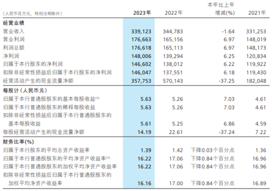 2023年,招商银行营业收入为3391.23亿元,同比降1.64%;归属于本行股东的净利润为1466.02亿元,同比增6.22%。净利润增长主要由于投资收益与公允价值变动收益同比增长,以及业务及管理费和信用减值损失同比下降。