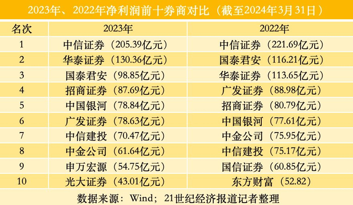 截至3月31日已经披露2023年年报的券商中,排在前十名的依次为中信证券(205.39亿元)、华泰证券(130.36亿元)、国泰君安(98.85亿元)、招商证券(87.69亿元)、中国银河(78.84亿元)、广发证券(78.63亿元)、中信建投(70.47亿元)、中金公司(61.64亿元)、申万宏源(54.75亿元)和光大证券(43.01亿元)。