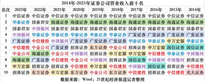 十年前的2014年,营收排在前十的是中信证券、海通证券、国泰君安、广发证券、华泰证券、国信证券、中国银河、招商证券、中信证券和光大证券。