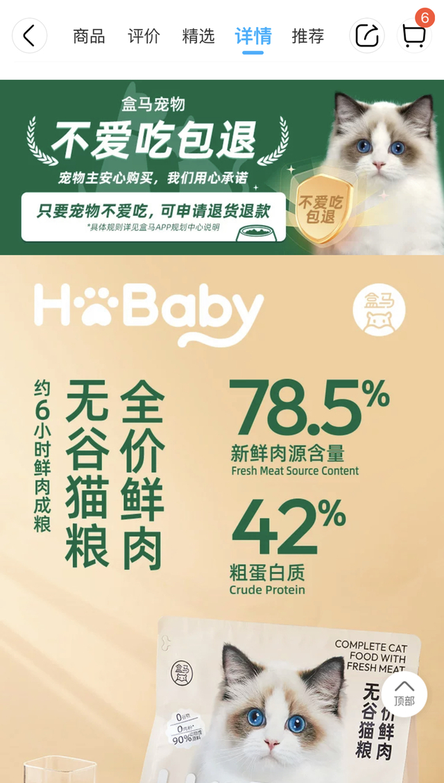 针对“挑食”又有语言障碍的毛孩子们,盒马上线“不爱吃包退”服务,帮助盒区房“铲屎官”们选择最合适的宠粮——选购带有“不爱吃包退”标识的商品后,如果宠物不喜欢口味、口感,导致不能进食,用户可通过盒马App说明情况、退货退款。