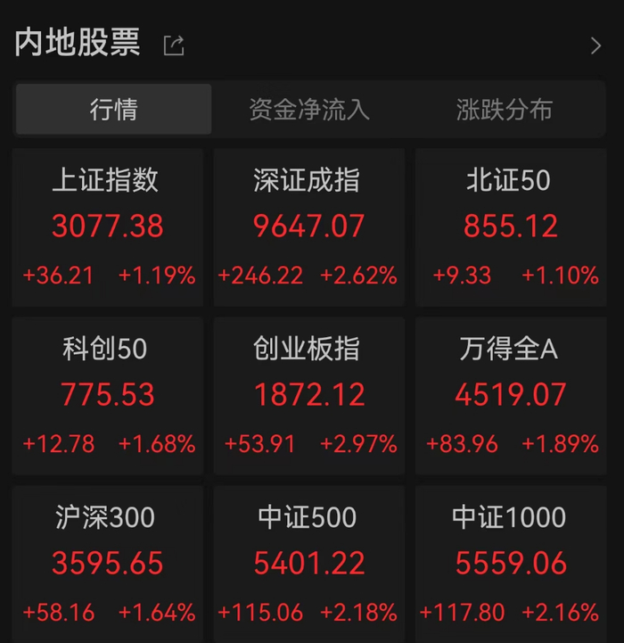 截至收盘,沪指涨1.19%报3077.38点,深成指涨2.62%报9647.07点,创业板指涨2.97%报1872.12点,上证50、北证50、科创50指数均涨超1%;两市合计成交9993亿元。