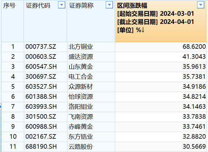 Wind数据显示,3月1日以来,申万有色金属行业139只个股中124只获得正收益,其中涨幅超20%的股票就有39只,北方铜业以68%的涨幅居首。