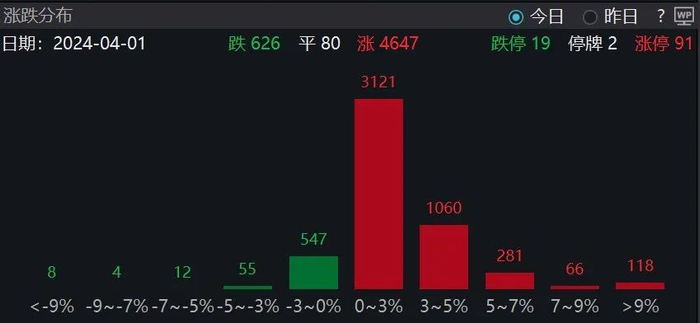 4月首个交易日,A股再现普涨行情。截至收盘,超4600只个股上涨,其中涨停91只。