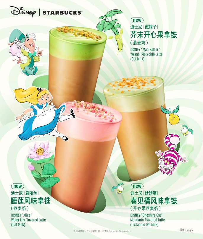 4月2日,星巴克中国宣布联合迪士尼经典IP《爱丽丝梦游仙境》,用三杯色彩纷呈、充满仙境气息的全新风味拿铁——迪士尼「爱丽丝」睡莲风味拿铁、迪士尼「妙妙猫」春见橘风味拿铁与迪士尼「疯帽子」芥末开心果拿铁,向你发出梦回仙境的邀请。