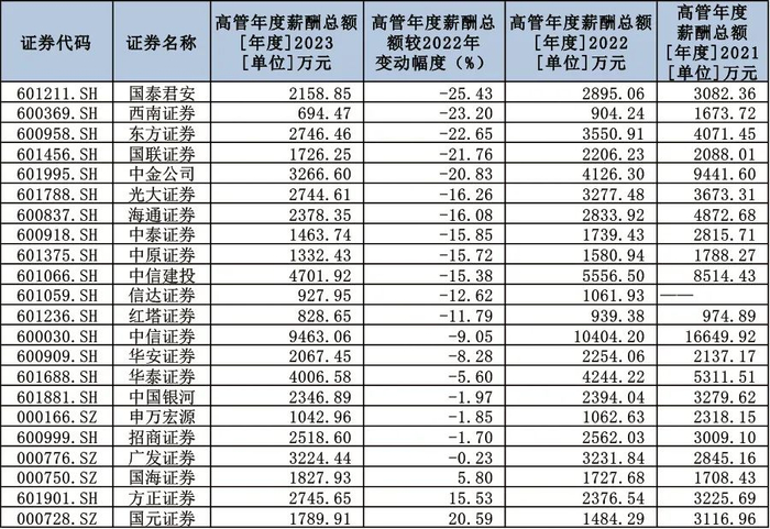 从降幅来看,国泰君安的高管2023年度薪酬总额为2158.85万元,较2022年下降超过25%。此外,西南证券、东方证券、国联证券、中金公司的高管年度薪酬总额较2022年的降幅超20%。