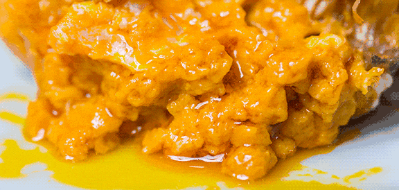 “黑”是乌米,那“金”指的就是裹在锅巴上厚厚的蟹粉。黑金锅巴用的蟹粉,食材来自深秋肥美的大闸蟹。深秋的大闸蟹肉质饱满,蟹黄肥厚,口感鲜美,营养价值高,用这种品质的螃蟹做成的蟹粉,更是将蟹黄的色香鲜美发挥到极致。