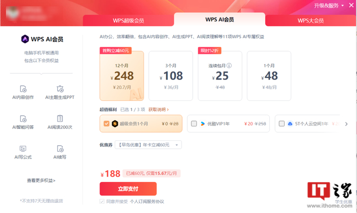 4月1日,WPS今日上线了WPS AI会员,独立于超级会员之外,连续包月25元/月。