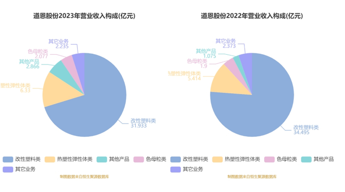 分产品来看,2023年公司主营业务中,改性塑料类收入31.93亿元,同比下降7.43%,占营业收入的70.27%;热塑性弹性体类收入6.33亿元,同比增长16.91%,占营业收入的13.93%;其他产品收入2.87亿元,同比增长166.52%,占营业收入的6.31%;色母粒类收入2.08亿元,同比增长9.35%,占营业收入的4.57%。