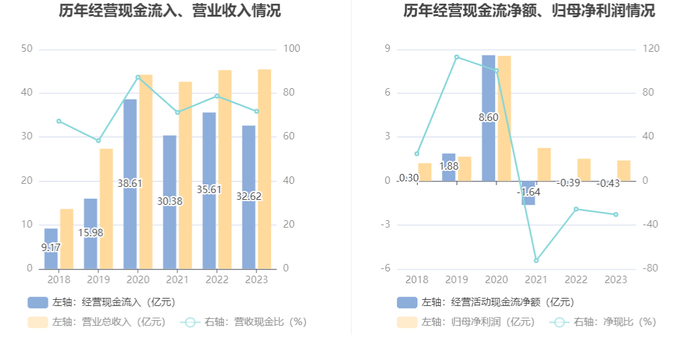 2023年,公司营业收入现金比为71.78%,净现比为-30.55%。