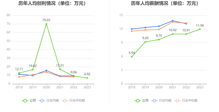 截至2023年末,公司员工总数为2022人,人均创收224.73万元,人均创利6.92万元,人均薪酬11.96万元,较上年同期分别变化-16.48%、-23.60%、9.59%。