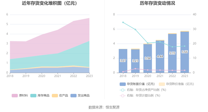 从存货变动来看,截至2023年年末,公司存货账面价值为5.66亿元,占净资产的18.37%,较上年末增加3090.99万元。其中,存货跌价准备为988.21万元,计提比例为1.72%。