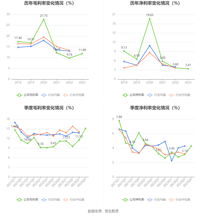 2023年,公司毛利率为11.88%,同比上升2.12个百分点;净利率为3.41%,较上年同期下降0.27个百分点。从单季度指标来看,2023年第四季度公司毛利率为15.14%,同比上升3.98个百分点,环比上升3.61个百分点;净利率为4.30%,较上年同期上升1.68个百分点,较上一季度上升1.16个百分点。
