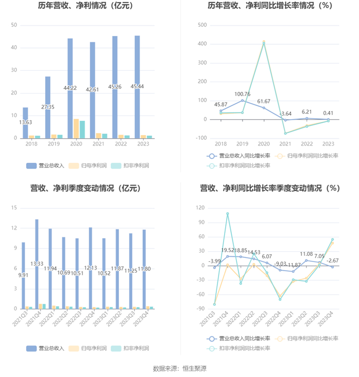 中证智能财讯 道恩股份(002838)4月2日披露2023年年报。2023年,公司实现营业总收入45.44亿元,同比增长0.41%;归母净利润1.40亿元,同比下降8.15%;扣非净利润1.15亿元,同比下降8.29%;经营活动产生的现金流量净额为-4276.33万元,上年同期为-3904.79万元;报告期内,道恩股份基本每股收益为0.31元,加权平均净资产收益率为4.59%。公司2023年年度利润分配预案为:拟向全体股东每10股派0.65元(含税)。