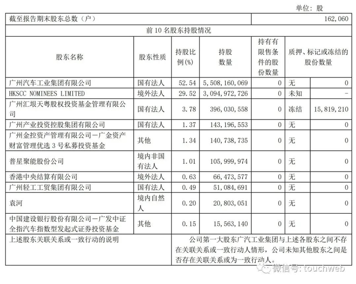 截至2023年6月30日,广州汽车工业集团有限公司持股52.54%,HKSCC NOMINEES LIMITED持股29.52%,广州汇垠天粤股权投资基金管理有限公司持股为3.78%,广州产业投资控股集团有限公司持股为1.37%;