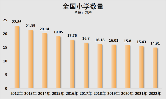 小学数量过去二十多年,因为城镇化导致农村大量小学关闭、合并,总数一直在减少。