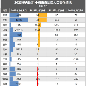 浙江省增加了50万人,2022年人口历史性减少的广东,增加了49万人,海南增加了15.98万人,上海增加了11.56万人,江苏增加了11万,北京增加了1.5万,天津增加了1万。