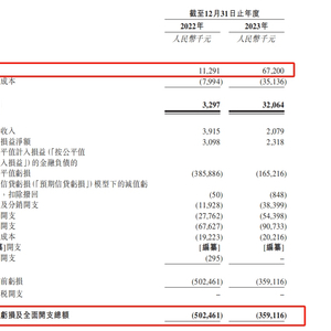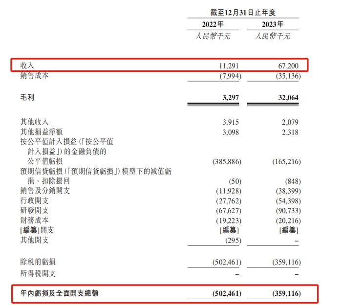 2022年及2023年,脑动极光的研发开支分别为6762.7万元、9073.3万元,占总收入的比例为598.95%、135.02%。加上其他各项开支,脑动极光的利润依然处于亏损状态,2022年及2023年的净亏损分别为5.02亿元、3.59亿元。