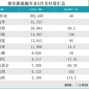 三言科技 4月1日消息,今日,多家新能源车企公布3月交付数据,三言科技汇总如下: