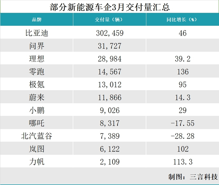 新能源车企3月交付量汇总:比亚迪超30万辆、问界全系超3万辆、理想28984辆