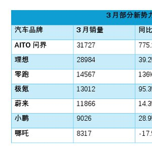 哪吒汽车3月销量垫底,仅8317辆,也是唯一一家同比销量下滑的汽车品牌。官方称,其桐乡工厂正在进行改建扩建工程,对3月和4月产量有较大影响。