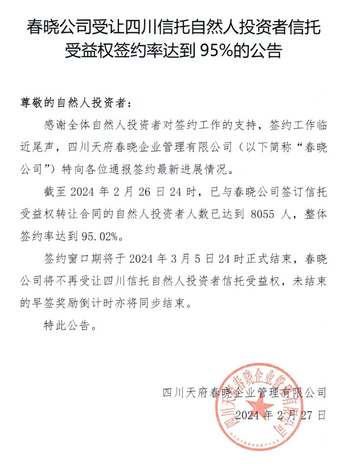 四川信托最新的公告显示,截止2月26日,已经与春晓公司签订受益权转让的自然人投资者达到8055人,整体签约率达到95.02%。