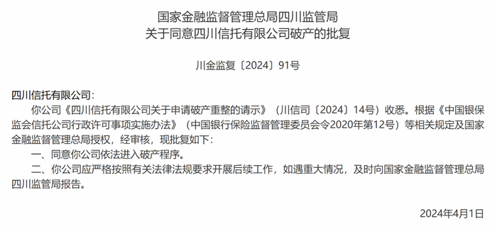 你公司《四川信托有限公司关于申请破产重整的请示》(川信司〔2024〕14号)收悉。根据《中国银保监会信托公司行政许可事项实施办法》(中国银行保险监督管理委员会令2020年第12号)等相关规定及国家金融监督管理总局授权,经审核,现批复如下: