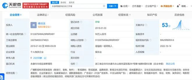公开信息显示,永康琪圆影视文化工作室为傅诗淇(成毅)个人独资企业,厦门晨起琪圆影视传媒有限公司则由傅诗淇(成毅)持股99%。