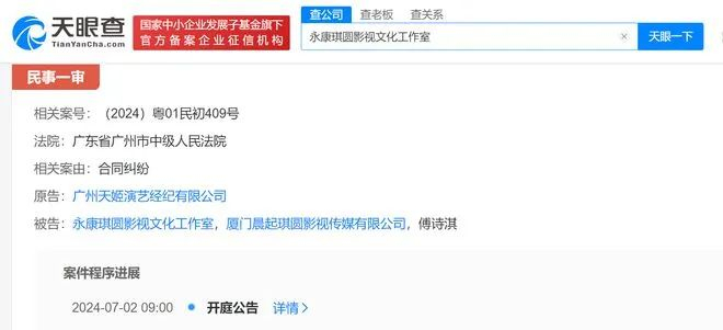 企查查APP显示,近日,成毅(傅诗淇)、永康琪圆影视文化工作室、 厦门晨起琪圆影视传媒有限公司新增开庭公告信息,原告为广州天姬演艺经纪有限公司(星汇天姬),案由为合同纠纷,案件将于7月2日在广东省广州市中级人民法院开庭审理。公开信息显示,星汇天姬为成毅前经纪公司。